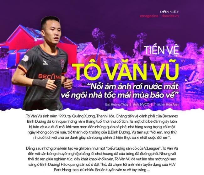 Nhắc đến ngôi nhà lợp lá cọ, Tô Văn Vũ bất giác bật khóc, tác giả bài viết cũng lặng đi trước cảm xúc nghẹn ngào của chàng trai từng Đội trưởng của CLB B.Bình Dương. Dường như trận bão trong ký ức vừa chạy qua tâm hồn Vũ, anh rưng rưng kể: "Mỗi mùa bão về, bố mẹ biết trước nửa đêm bão sẽ càn quét rất mạnh nên đã gửi hai anh em Vũ đến ngôi nhà họ hàng vững chắc hơn. Bố mẹ ở lại nhà để bảo vệ tài sản bằng tất cả nỗ lực nhỏ bé của con người trước sự tàn phá khủng khiếp của thiên nhiên. Cứ mỗi lần như thế, bố mẹ lại mất 2-3 ngày lợp lại mái nhà".