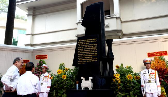 Bia Tưởng niệm chiến sĩ Biệt động Sài Gòn hy sinh trong cuộc Tổng tiến công và nổi dậy Xuân Mậu Thân năm 1968, tại Hội trường Thống Nhất - số 108 Nguyễn Du, P. Bến Nghé, Quận 1 (Ảnh TL)