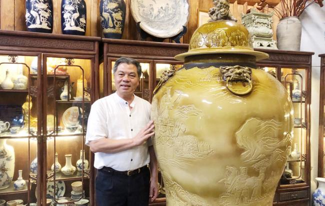 Nghệ nhân ưu tú Tô Thanh Sơn bên sản phẩm gốm của gia đình tại xã Bát Tràng (huyện Gia Lâm).Ảnh: Kiều Oanh